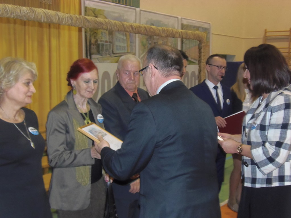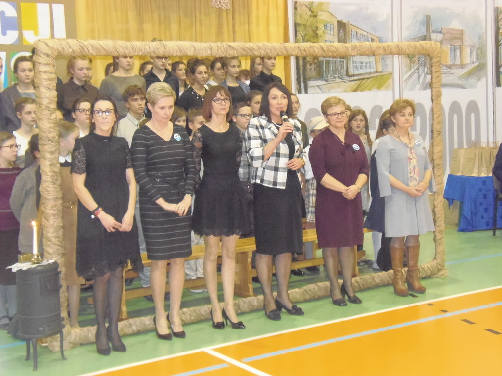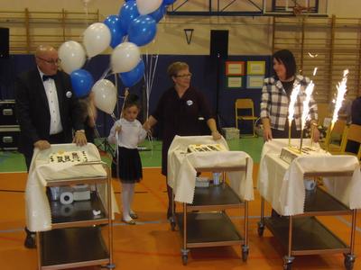 Dodatkową atrakcją kończącą obchody stulecia edukacji w naszej szkole było zapalenie sztucznych ogni na wspaniałych trzech jubileuszowych tortach, umiejscowionych na wielkich stołach, z którymi weszła pani Anna Stoparczyk -dyrektor placówki i Jej zastępcy. Ten słodki akcent zakończył uroczystość, ale jeszcze długo na szkolnych korytarzach można było zobaczyć grupki ludzi, ze zdziwieniem rozpoznających znane im twarze na wystawionych zdjęciach i wspominających swoje młodzieńcze lata spędzone w naszej szkole. Degustacja ciast, przygotowanych przez rodziców, w kawiarence obsługiwanej przez Koło Gospodyń Wiejskich, także stała się okazją do rozmów i wspomnień o przeszłości.