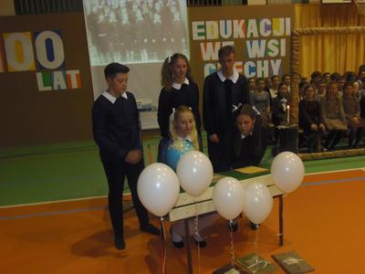 Dzięki zaangażowaniu nauczycieli, uczniów oraz ich rodziców, a także społeczności lokalnej przygotowano imponujący spektakl. Występujący mali aktorzy słowem, pieśnią i tańcem poprowadzili widzów przez sto lat historii naszej szkoły. Całość przedstawienia uzupełniały emitowane na ekranie fotografie przedstawiające pierwsze budynki szkolne. Wyświetlono także prezentację multimedialną, w której pokazano zarówno kolejne etapy budowy obiektu, jak i ludzi, którzy swoją pracą i nauką odcisnęli ślad w historii funkcjonowania szkoły.