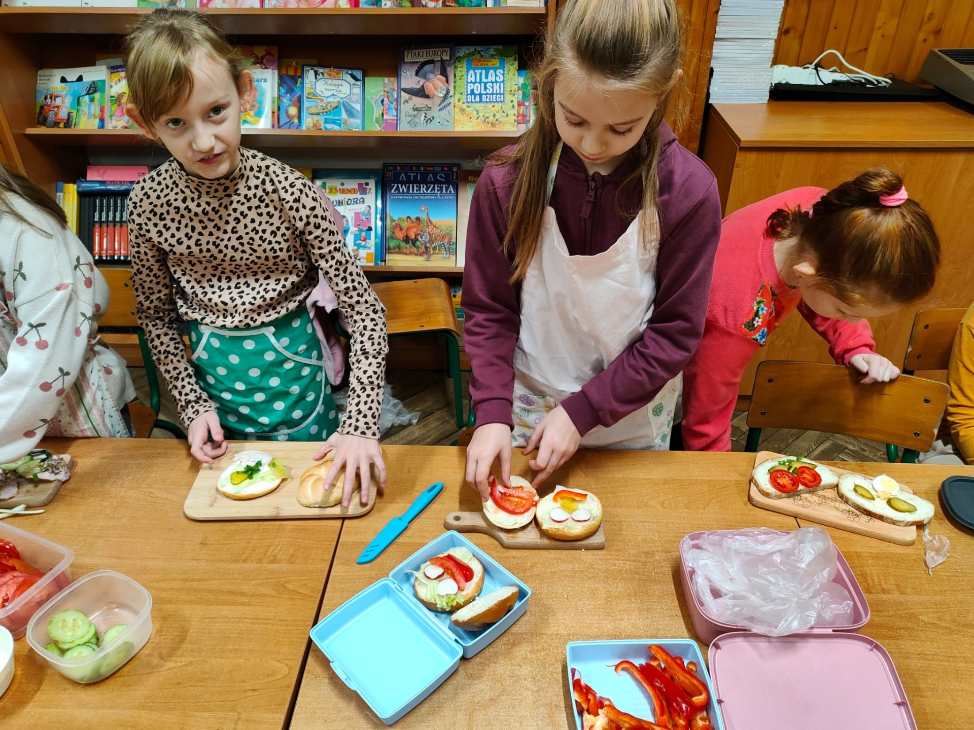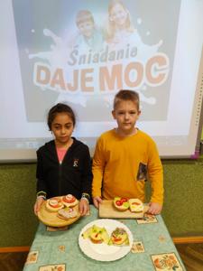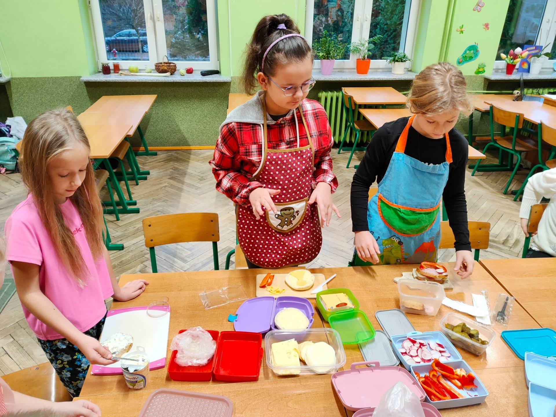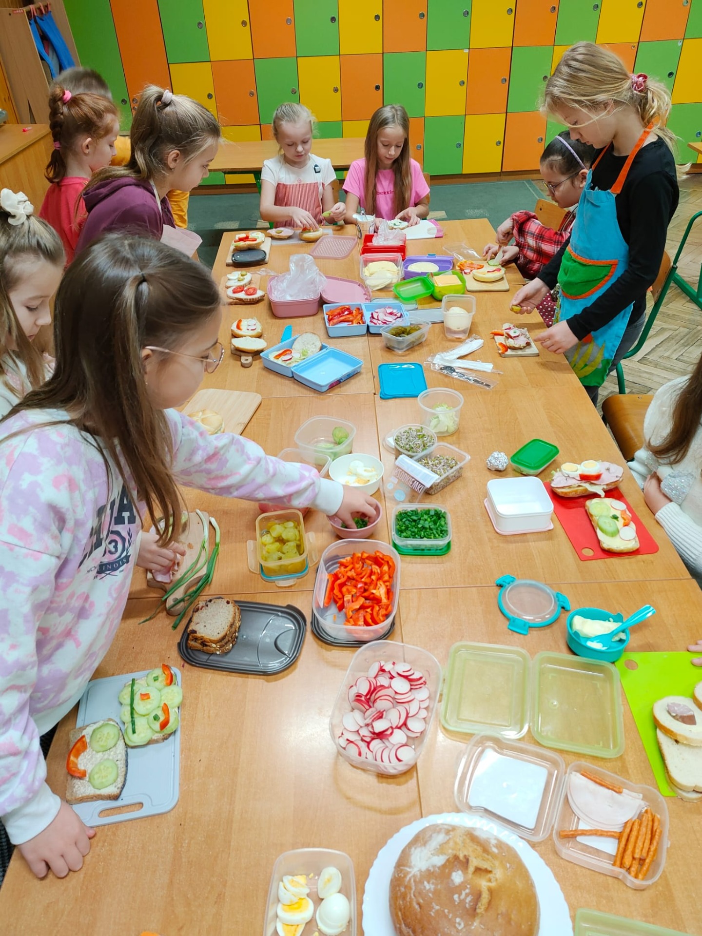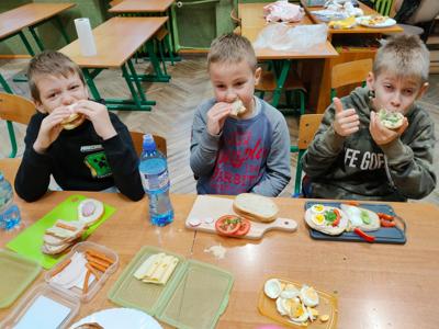 Uczniowie obejrzeli film edukacyjny, poznali 12 zasad zdrowego odżywiania oraz przypomnieli reguły zachowania się przy stole. Z domowego chleba upieczonego przez jedną z mam, przygotowali kolorowe, pyszne i zdrowe kanapki. Podczas wspólnego śniadania, zwracano uwagę nie tylko na wartości odżywcze, ale i na kulturę jedzenia. Wspólne przygotowanie i spożywanie śniadania sprawiło dzieciom wiele przyjemności i radości, a udział w akcji na pewno przyczyni się do zmiany nawyków żywieniowych i większej dbałości o spożywanie śniadania – w domu i szkole.