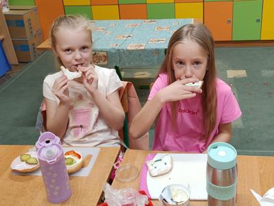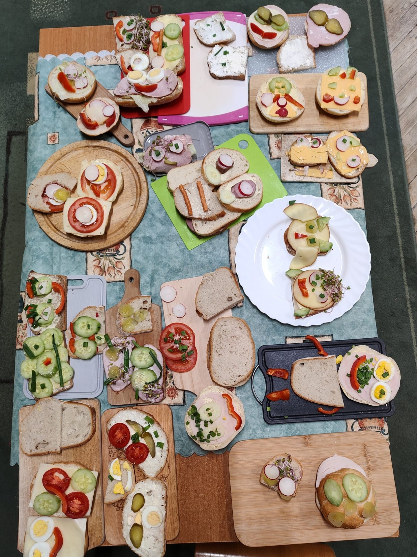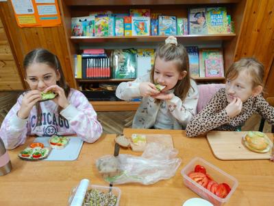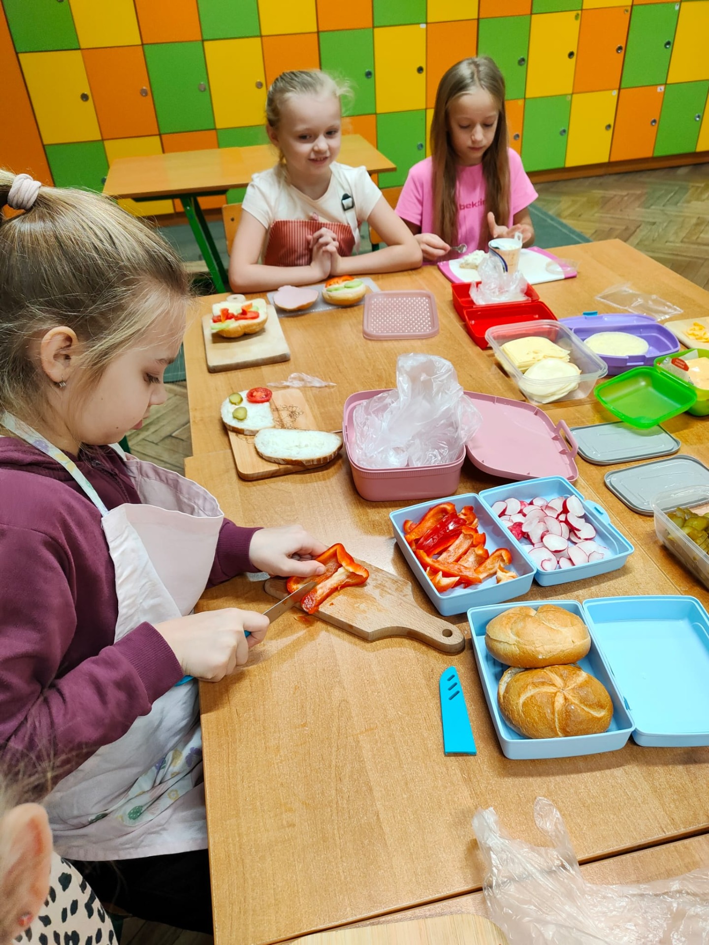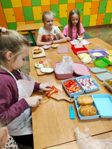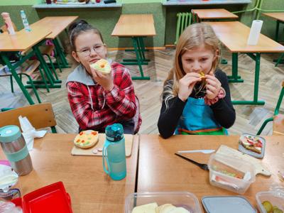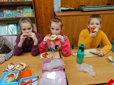 Uczniowie obejrzeli film edukacyjny, poznali 12 zasad zdrowego odżywiania oraz przypomnieli reguły zachowania się przy stole. Z domowego chleba upieczonego przez jedną z mam, przygotowali kolorowe, pyszne i zdrowe kanapki. Podczas wspólnego śniadania, zwracano uwagę nie tylko na wartości odżywcze, ale i na kulturę jedzenia. Wspólne przygotowanie i spożywanie śniadania sprawiło dzieciom wiele przyjemności i radości, a udział w akcji na pewno przyczyni się do zmiany nawyków żywieniowych i większej dbałości o spożywanie śniadania – w domu i szkole.