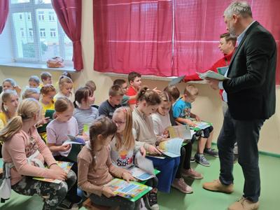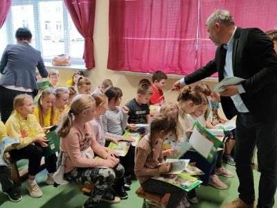 Podsumowując i utrwalając wiedzę, przedstawiciele KRUS rozdali drobne upominki – książeczkę „Bezpieczeństwo, czyli jak uniknąć wypadków na wsi”, plany lekcji, malowanki