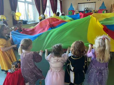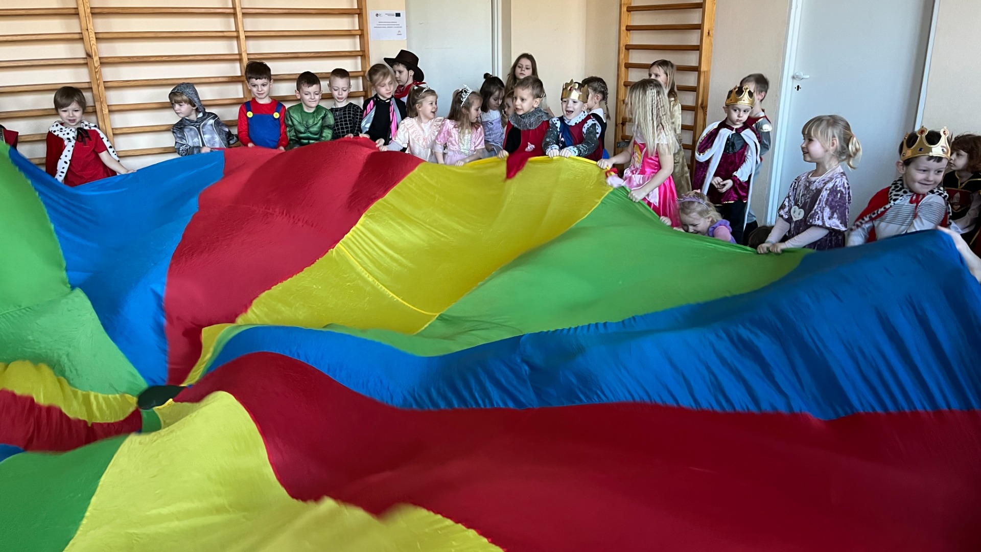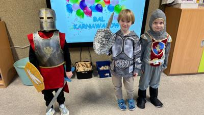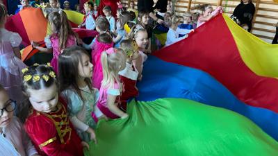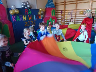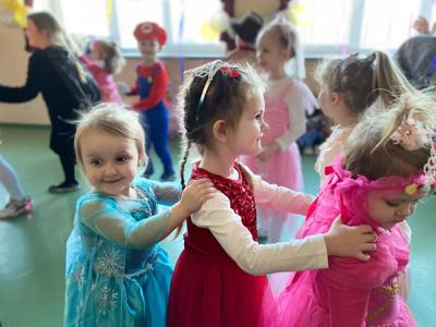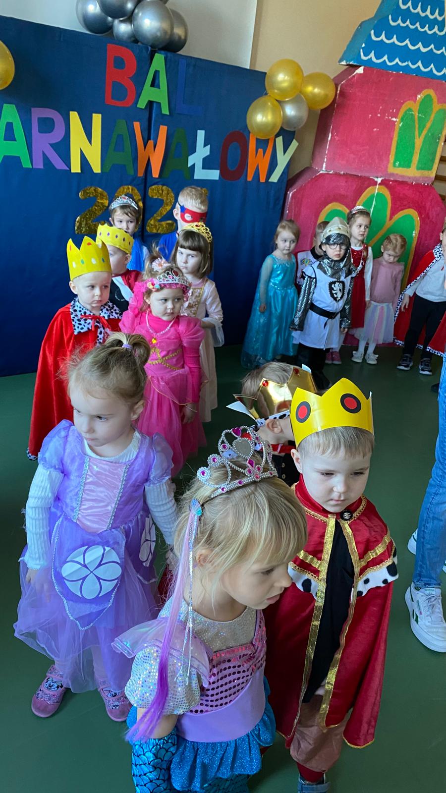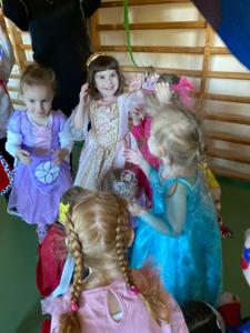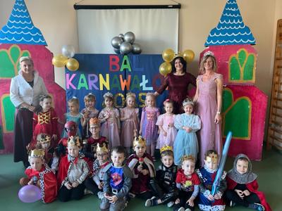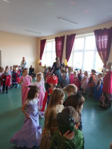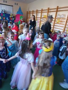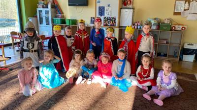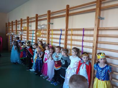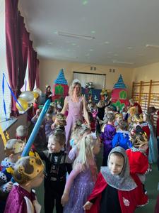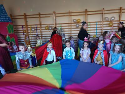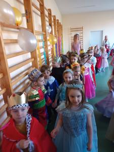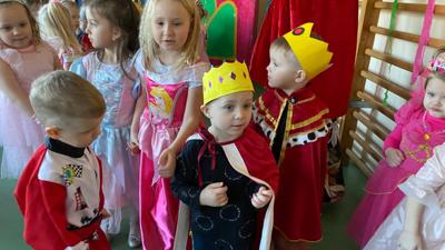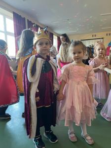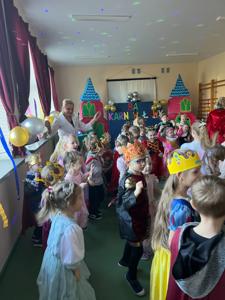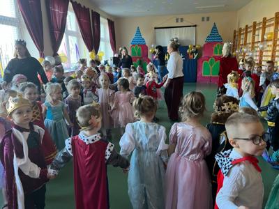 Myśląc o temacie przewodnim naszego przedszkolnego Balu Karnawałowego, nie mogliśmy pominąć tego wydarzenia. Zamieniliśmy zatem salę gimnastyczną w salę balową zamku królewskiego. Rozpoczęliśmy od orszaku, aby zaprezentować stroje wszystkich królów, książąt, księżniczek, dam dworu, rycerzy i innych postaci związanych z życiem na zamku. Następnie był pierwszy taniec wykonany przez pary przedszkolaków w korowodzie królewski. Od tego momentu uczta balowa nabrała tempa, a zabawa pewnie mogłaby trwać nawet do rana. Na szczęście każdy szanujący się mieszkaniec dworu musi czasami udać się na odpoczynek. Dziękujemy pani Agnieszce Grzegorzewskiej za iście królewskie animacje, a rodzicom przedszkolaków za zaangażowanie włożone w tworzenie tak różnorodnych strojów dla dzieci