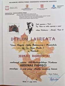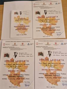Tytuł Laureata Konkursu otrzymali uczniowie z naszej szkoły: Anastazja Matusiak, Jędrzej Dąbrowski, Mikołaj Felczerek oraz Julian Kowalkiewicz. Prace, które napisali były dowodem rzetelnego warsztatu historycznego oraz głębokiego zaangażowania i wrażliwości.