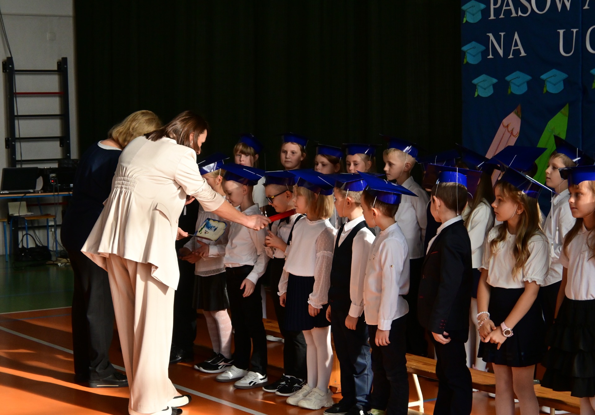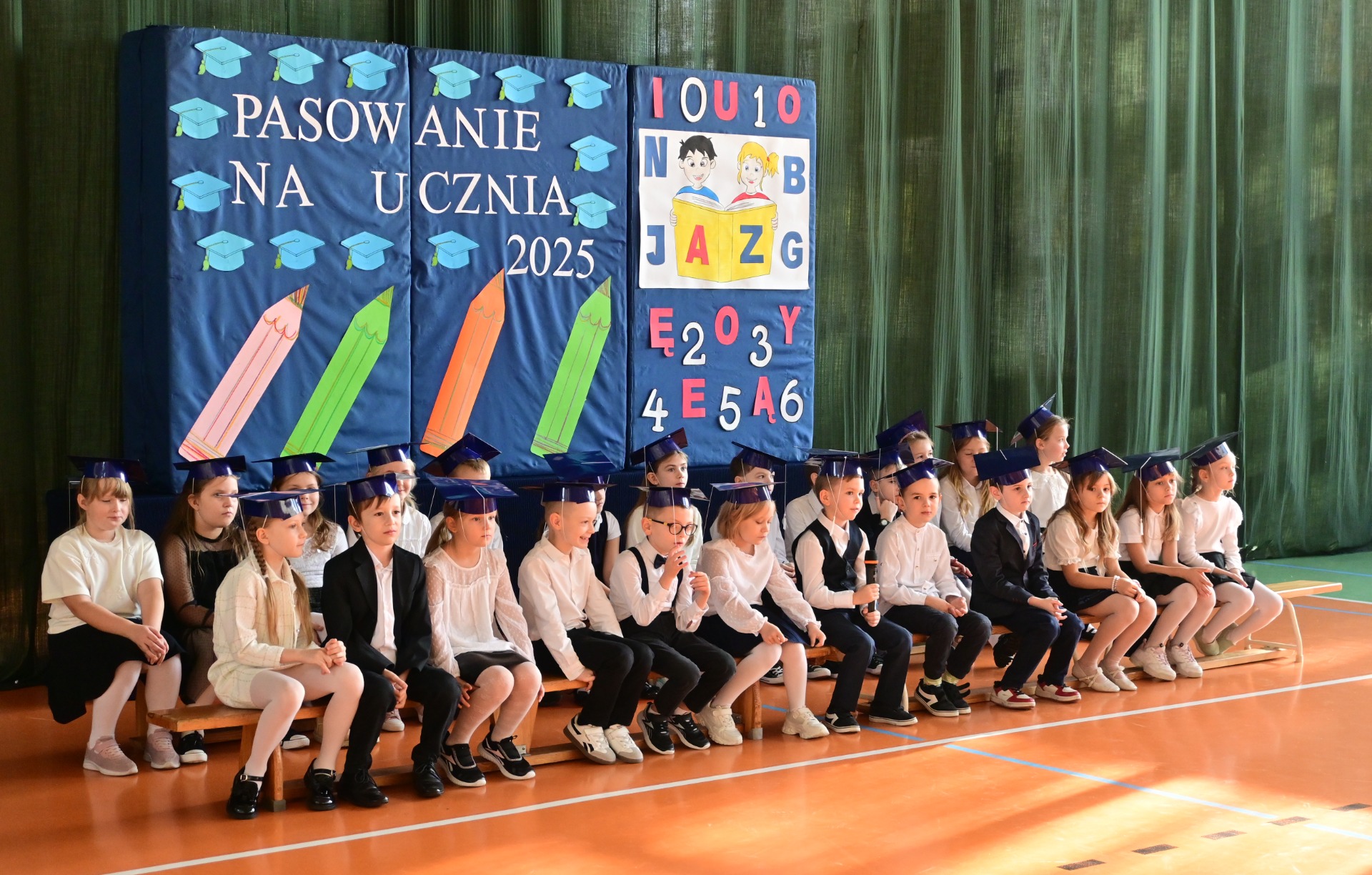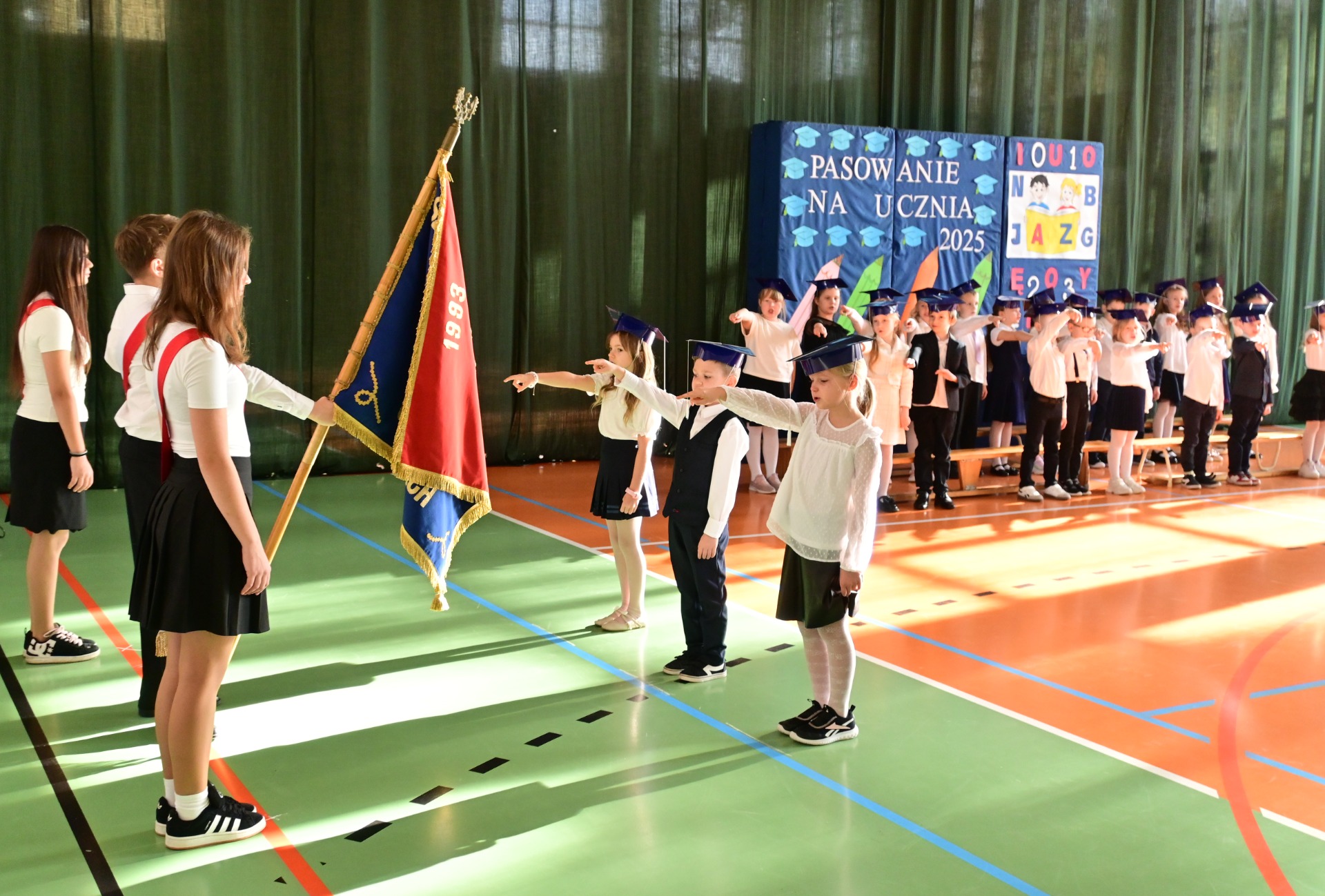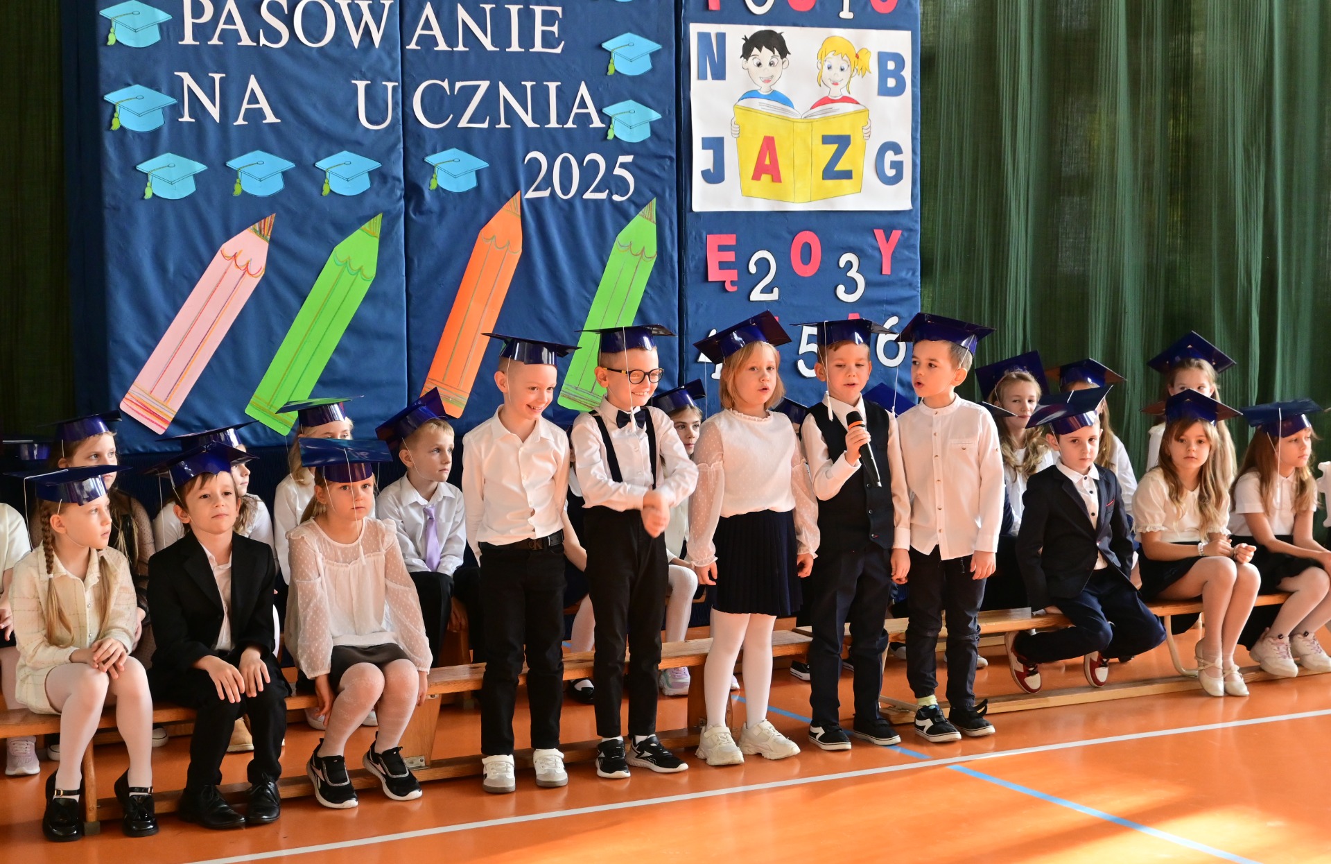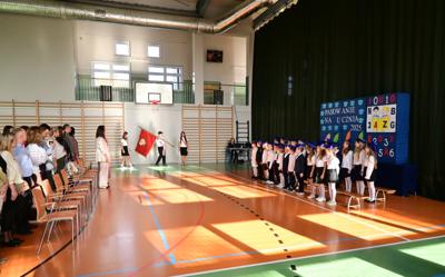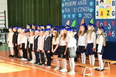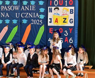 Elegancko ubrani i pełni emocji pierwszoklasiści zaprezentowali swoje umiejętności, recytując wiersze i śpiewając piosenki. Występy spotkały się z ogromnym uznaniem zgromadzonej publiczności. Najbardziej oczekiwanym momentem było jednak uroczyste ślubowanie, podczas którego dzieci obiecały być pilnymi i odpowiedzialnymi uczniami oraz dbać o dobre imię swojej klasy i szkoły. Następnie Pani Dyrektor Anna Stoparczyk dokonała aktu pasowania wielkim, symbolicznym ołówkiem.