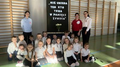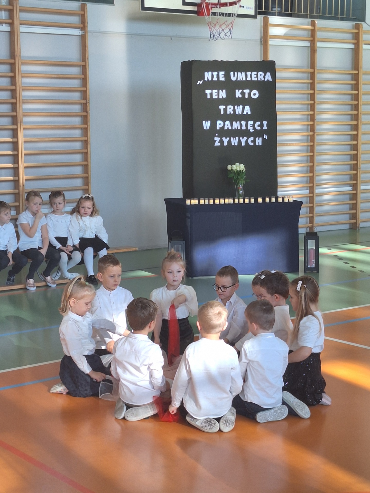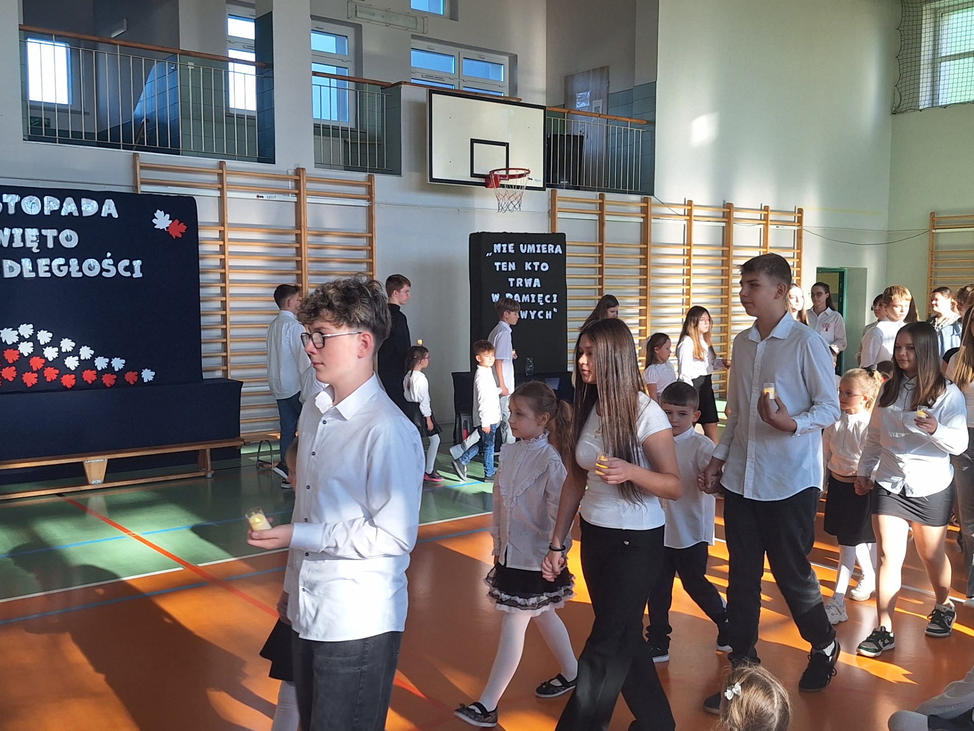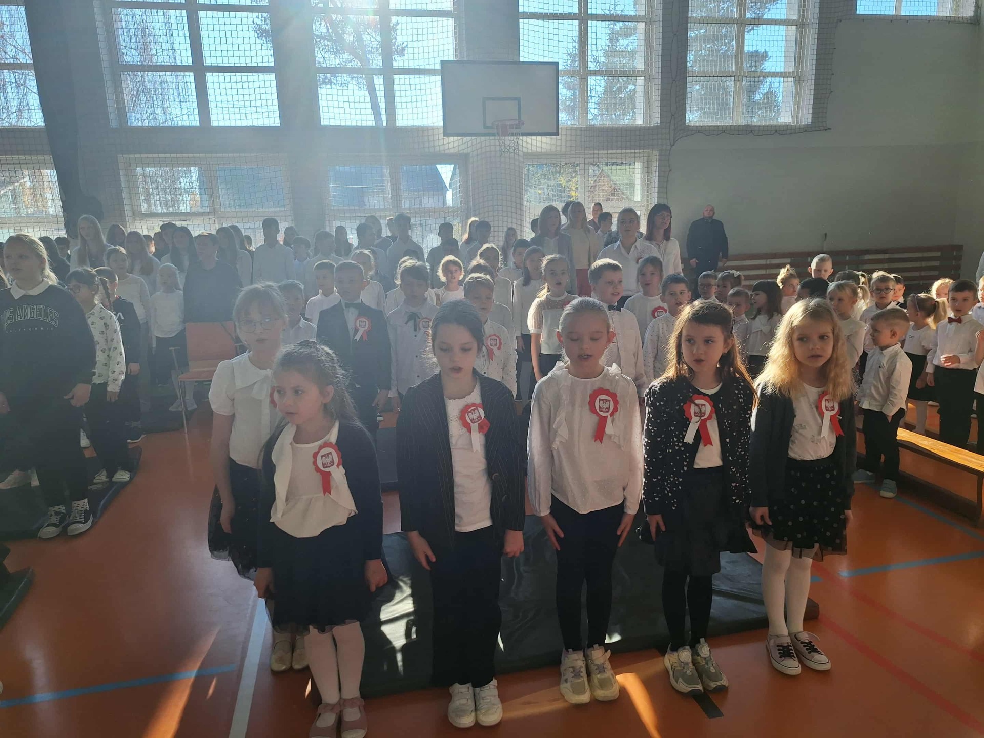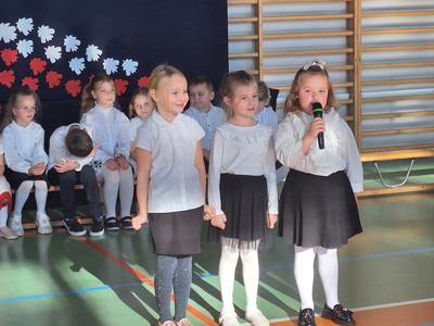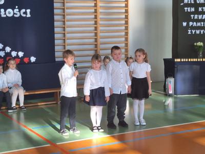 Uroczystość rozpoczęła się od wprowadzenia sztandaru i wspólnego odśpiewania hymnu narodowego. W zadumie i skupieniu uczniowie i dzieci przedszkolne oddali hołd tym, którzy walczyli o wolność naszej ojczyzny.